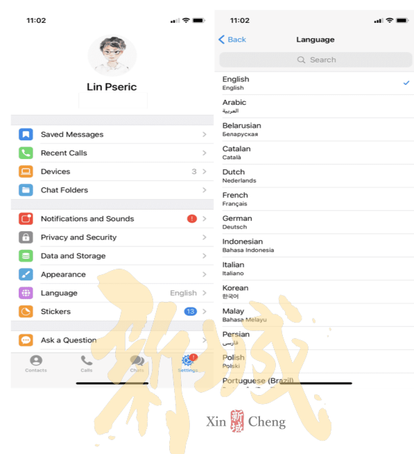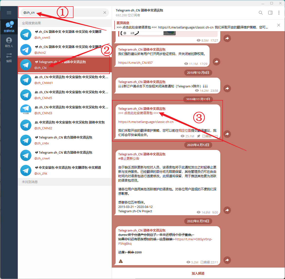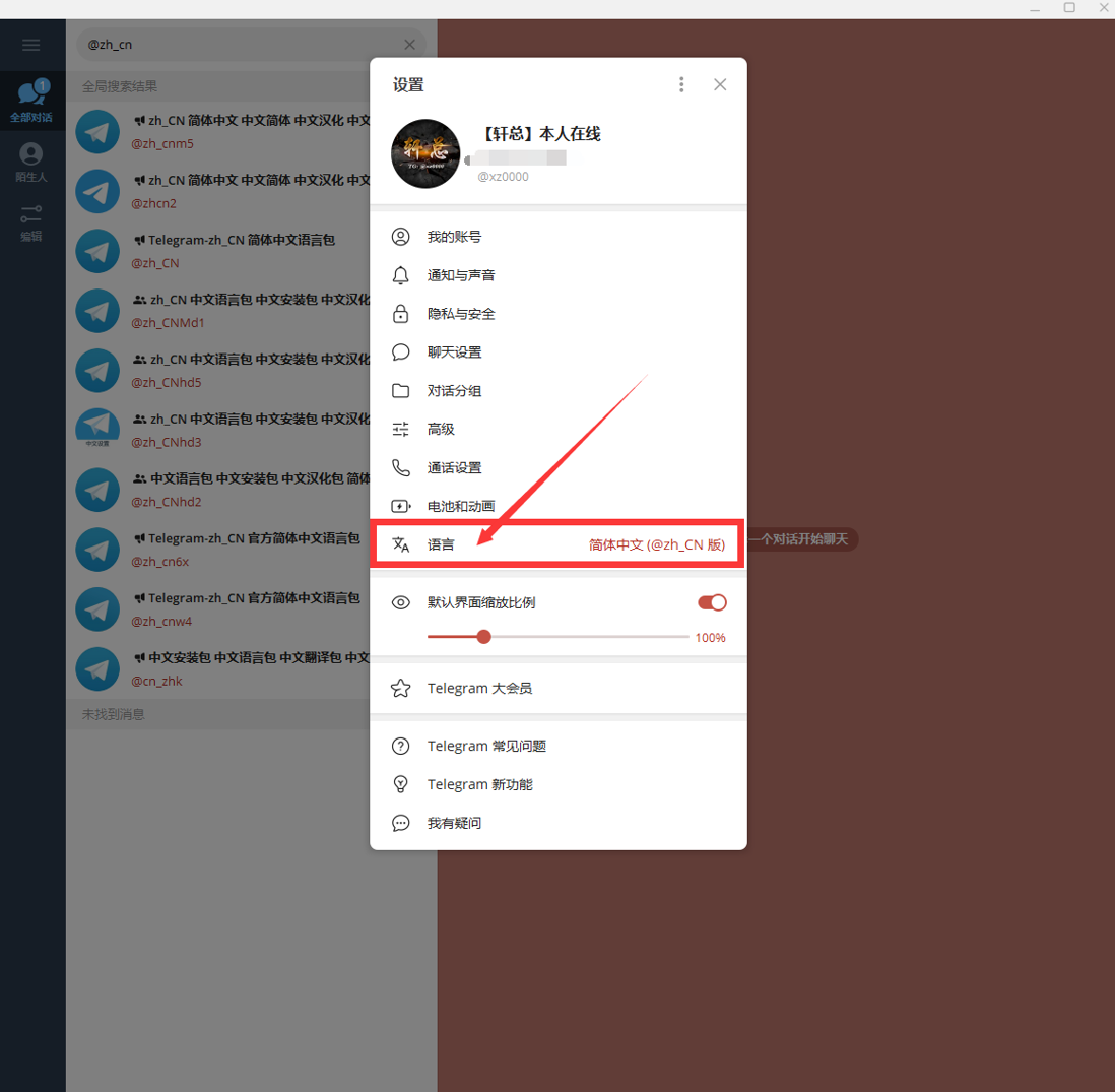 第五步:汉化Telegram,在 Telegram 软件的搜索框输入 @zh_CN